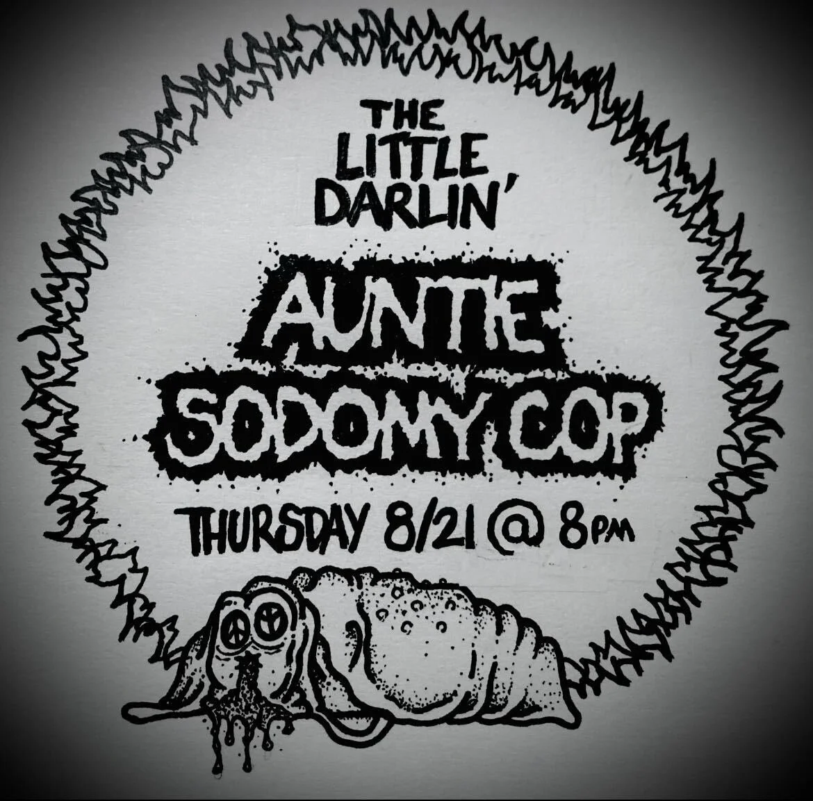 Aug 21 AUNTIE / SODOMY COP Thursday, August 21, 2025 8:00 PM 10:30 PM The Little Darlin' (map) Google Calendar ICS View Event →