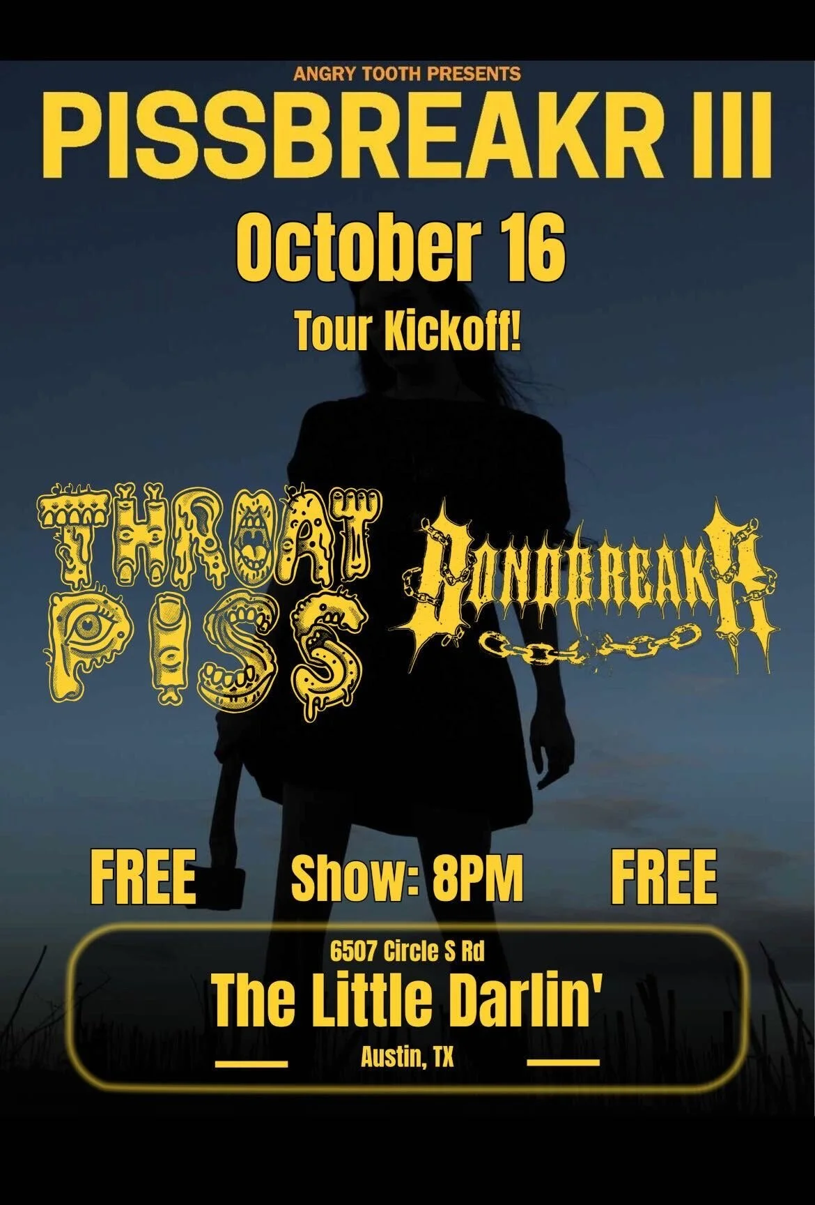 Oct 16 PISSBREAKR III : THROATPISS / BONDBREAK Thursday, October 16, 2025 8:00 PM 10:30 PM The Little Darlin' (map) Google Calendar ICS View Event →