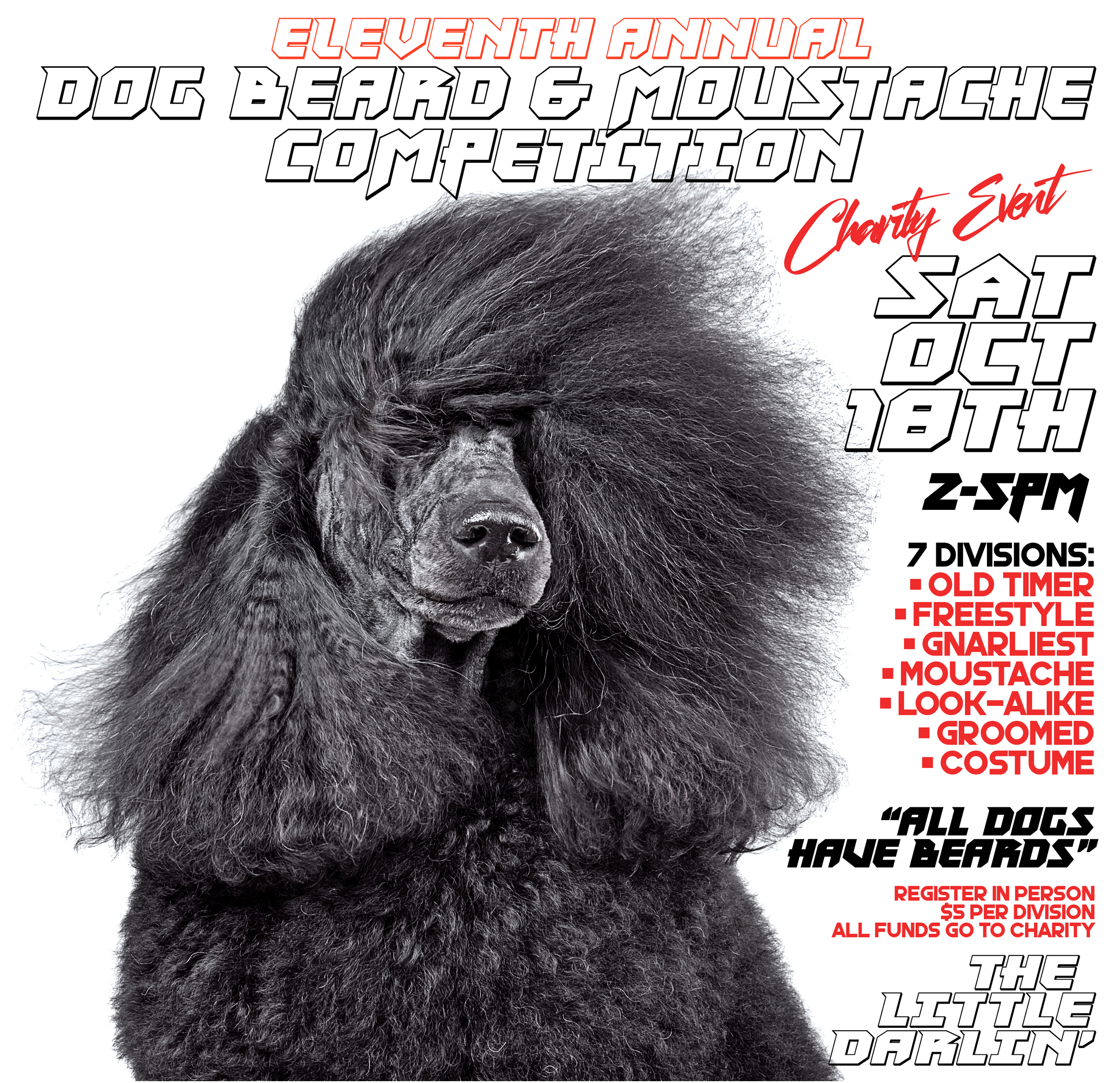 Oct 18 11th ANNUAL DOG BEARD & MOUSTACHE COMPETITION Saturday, October 18, 2025 2:00 PM 5:00 PM The Little Darlin' (map) Google Calendar ICS View Event →