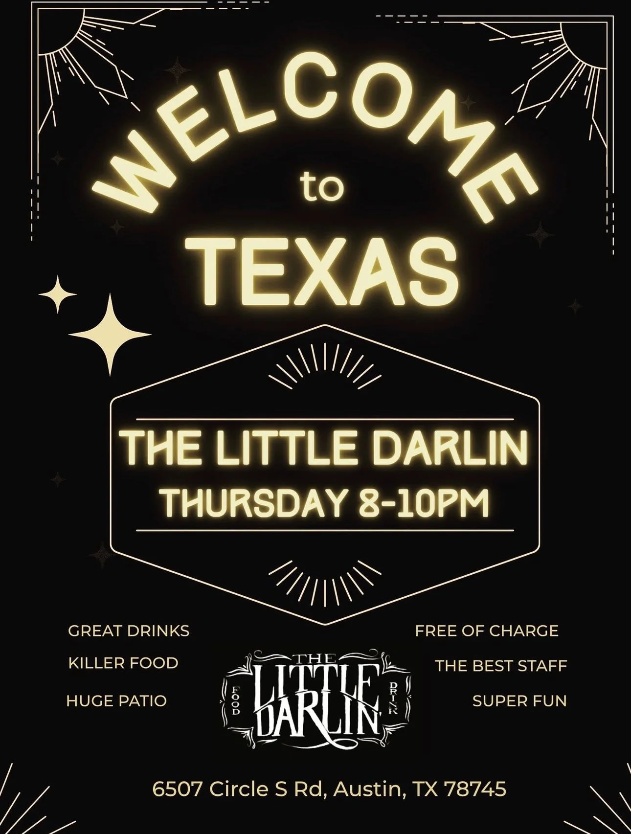 Nov 6 WELCOME TO TEXAS Thursday, November 6, 2025 8:00 PM 10:00 PM The Little Darlin' (map) Google Calendar ICS View Event →