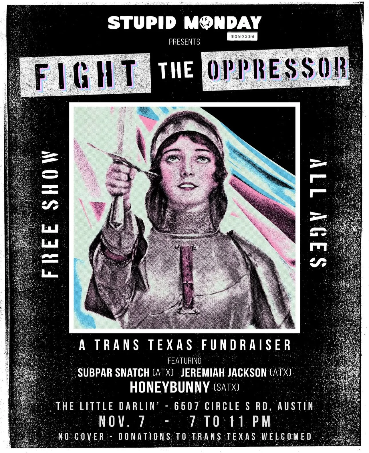 Nov 7 FIGHT THE OPPRESSOR: A TRANS TEXAS FUNDRAISER Friday, November 7, 2025 7:00 PM 11:00 PM The Little Darlin' (map) Google Calendar ICS View Event →